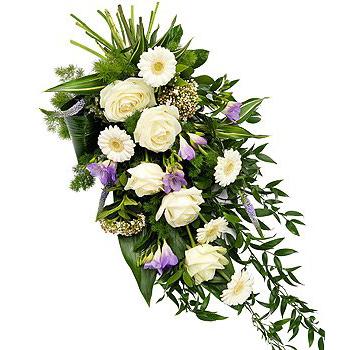 A delicately scented white Rose and lavender Freesia hand tied sheaf with lavender Veronica, white Germini and Viburnum blooms.