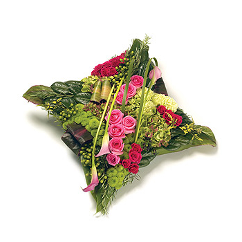 A stunning textured cushion design with an array of flowers & foliage including Roses, Hydrangea , Hypericum Calla Lilies and complementary foliage edging. Size: 43cm (17").
