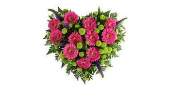A heart tribute, including gerbera, veronica, green Kermit and foliage.