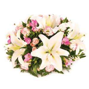 A pretty posy arrangement in shades of pink or white including pink/white freesia, spray roses, pink/white eustoma and white orientals filled with leather leaf.