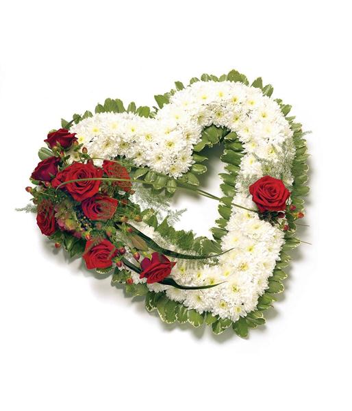 Classic white Chrysanthemum based open heart shape wreath with Roses, complementary foliage and foliage edge. Size: Height - 38cm (15") Length - 37cm (14").
