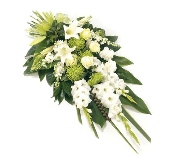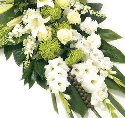 Mixed sheaf including Lilies, Gladioli, Chrysanthemums, Stocks and complementary foliage. Size: 48cm (19").