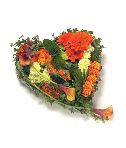 A contemporary heart shaped tribute in eye catching orange and gold tones. Includes Roses, Calla Lilies, Celosia, Gerbera, Chrysanthemums and Carnations.