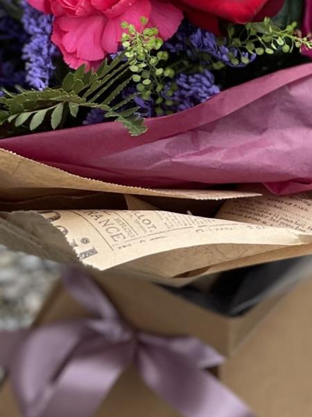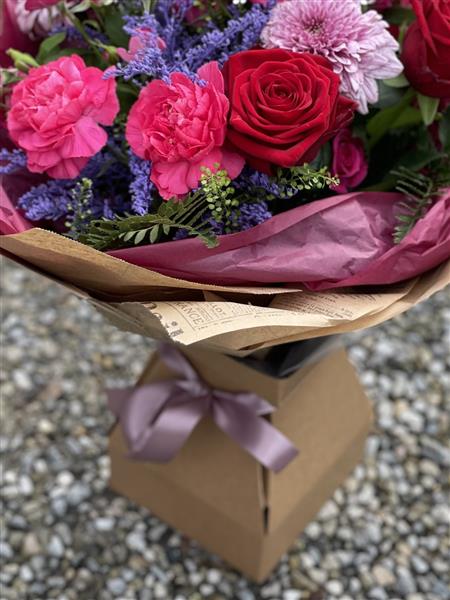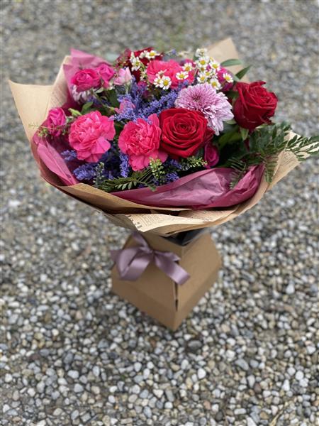 A beautiful hand-tied bouquet featuring rich red roses, vibrant pink carnations, and delicate seasonal blooms, accented with fresh greenery for a romantic colourful gift, perfect for any occasion with flower delivery Portlaoise.