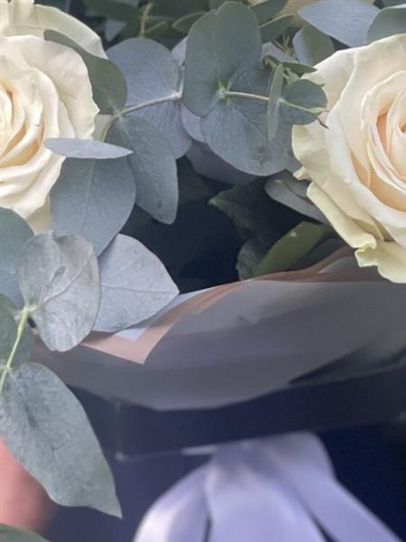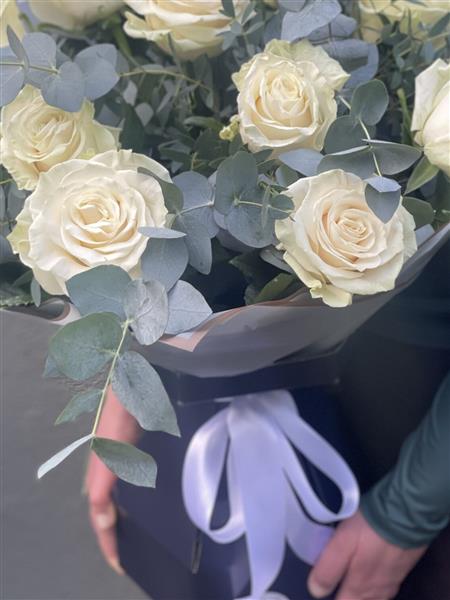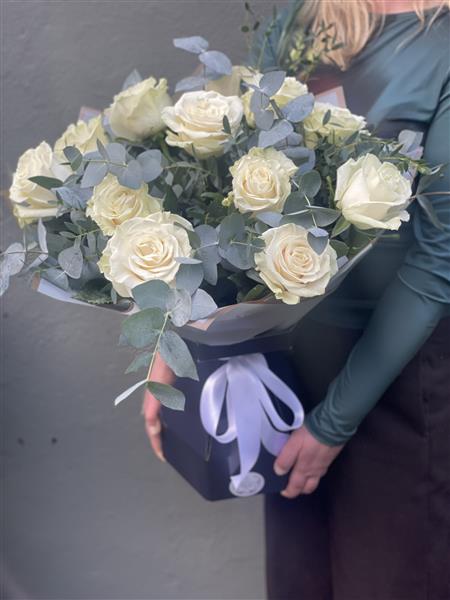 A luxurious arrangement of elegant ivory roses paired with fresh eucalyptus, beautifully presented in a stylish box for a timeless sophisticated gift, perfect for any occasion with flower delivery Portlaoise.