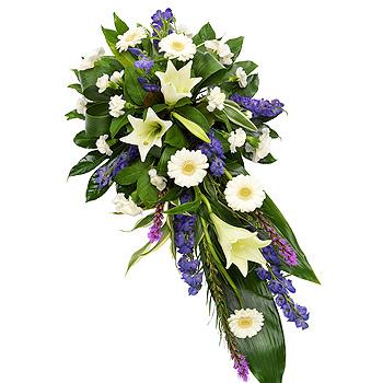 A gorgeous white and purple single ended spray. White Longiflorum Lilies, Germini and Carnations are interspersed with purple Aconitum and Liatris. Luscious green foliage completes the design beautifully.
