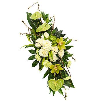 A beautiful white Rose and green Cymbidium Orchid double ended spray with green bloom Chrysanthemums, Anthuriums and Carnations.