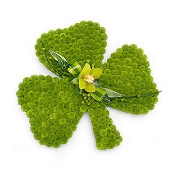 A luscious green Shamrock shaped tribute. A green Cymbidium Orchid sits on a base of green spray Chrysanthemums with variegated lime Dracaena and green Hypericum.