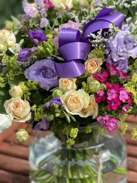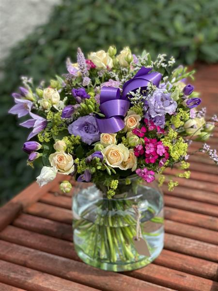 A charming vase arrangement featuring soft cream roses, delicate purple blooms, and seasonal flowers, beautifully styled with fresh greenery for an elegant gift, perfect for any occasion with flower delivery Portlaoise.