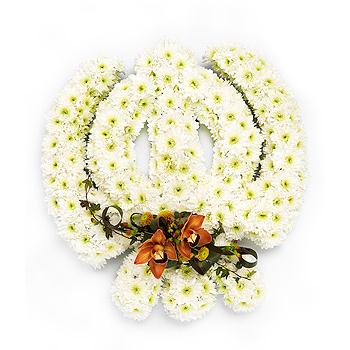 A white Chrysanthemum based Sikh Khanda symbol tribute with bronze Chrysanthemum and Cymbidium Orchid flourish.