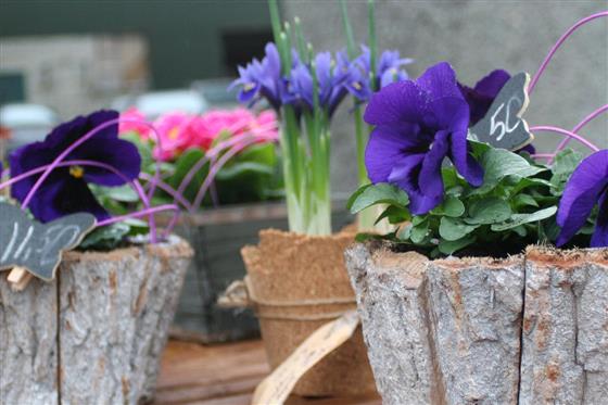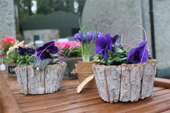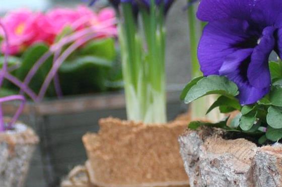 A charming spring planted arrangement featuring vibrant Viola plants, known for their rich colour and delicate blooms. Presented in a rustic bark-style planter and finished with decorative accents, this design brings a natural woodland feel to any setting.