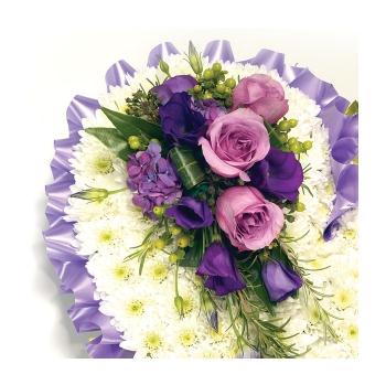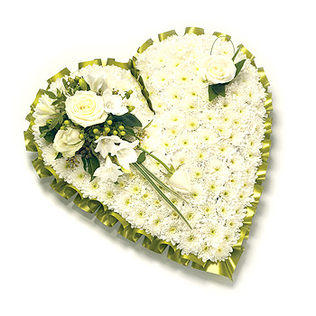 Classic white Chrysanthemum based heart shaped tribute with Roses, Freesia & Hypericum and complementary foliage edge. Size: Height - 33cm (13") Length - 33cm (13").