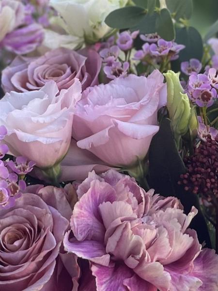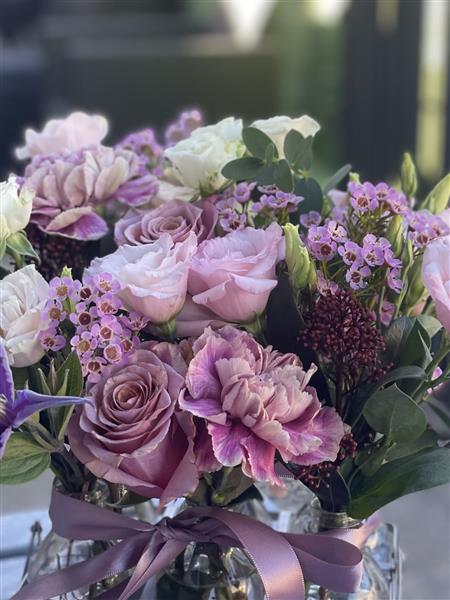 A delicate vintage style arrangement featuring soft blush roses, lilac blooms, and seasonal flowers, beautifully presented in a glass vase display for a romantic elegant gift with flower delivery Portlaoise.