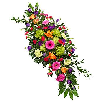 A vibrant double ended spray featuring orange Roses, pink Germini, purple Lisianthus with green Chrysanthemums and Carnations.