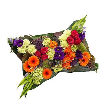 A vibrantly coloured pillow featuring cerise and orange Roses, orange Germini, purple Lisianthus and Trachelium, green Carnations and Hydrangea. Aspidistra leaves, Bun Moss and Cherry Blossom foliage complete this stunning design.