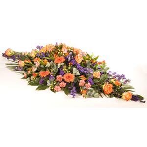 A warm and vibrant casket spray in shades of soft orange and blues.