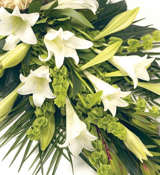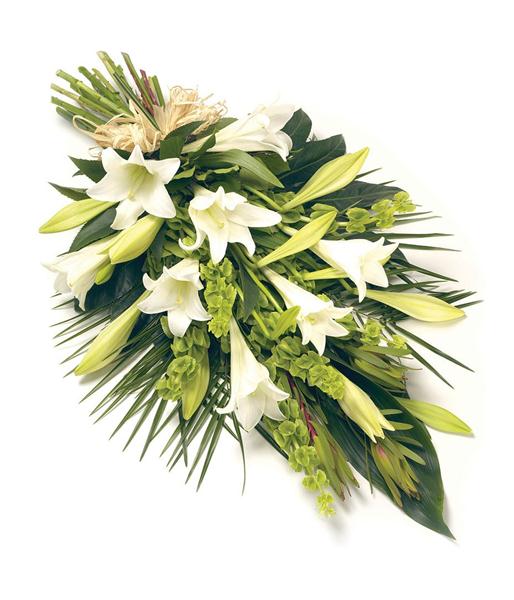 A classic and natural sheaf of Longiflorum Lilies, 'Bells of Ireland' and complementary foliage tied with a natural raffia bow. Size: 64cm (25").