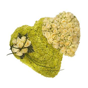 A gorgeous double heart wreath, one featuring white Roses, the other green Carnations with a spray of white Roses and a Lily Grass flourish.