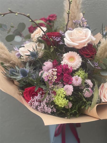 A stylish rustic bouquet featuring soft blush and red roses, textured thistles, and seasonal blooms, accented with natural pampas grass for a modern earthy feel, perfect for gifting with flower delivery Portlaoise.