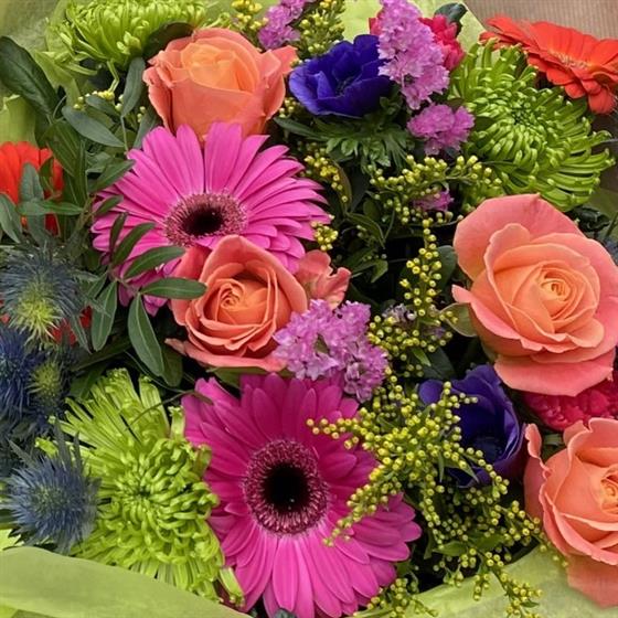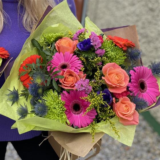 A bright and colourful bouquet featuring vibrant gerberas, peach roses, and textured seasonal blooms, beautifully arranged with fresh greenery for a cheerful modern gift, perfect for any occasion with flower delivery Portlaoise.