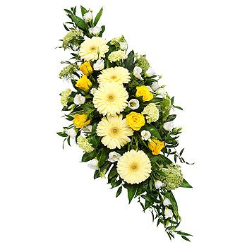 A double ended spray featuring yellow Roses, cream Gerbera, white Lisianthus, Ammi and green Carnations.