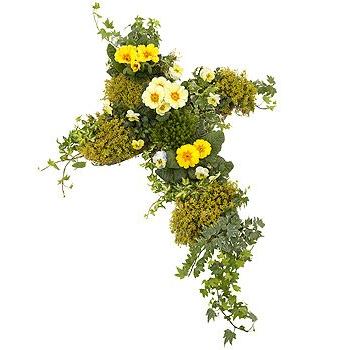 Gold Primula, Yellow Primula, Cream Viola Plant, Gold Thyme Plant, Green Thyme Plant, Variegated Ivy, Opiflor Cross Memorial Planter Ponderosa.