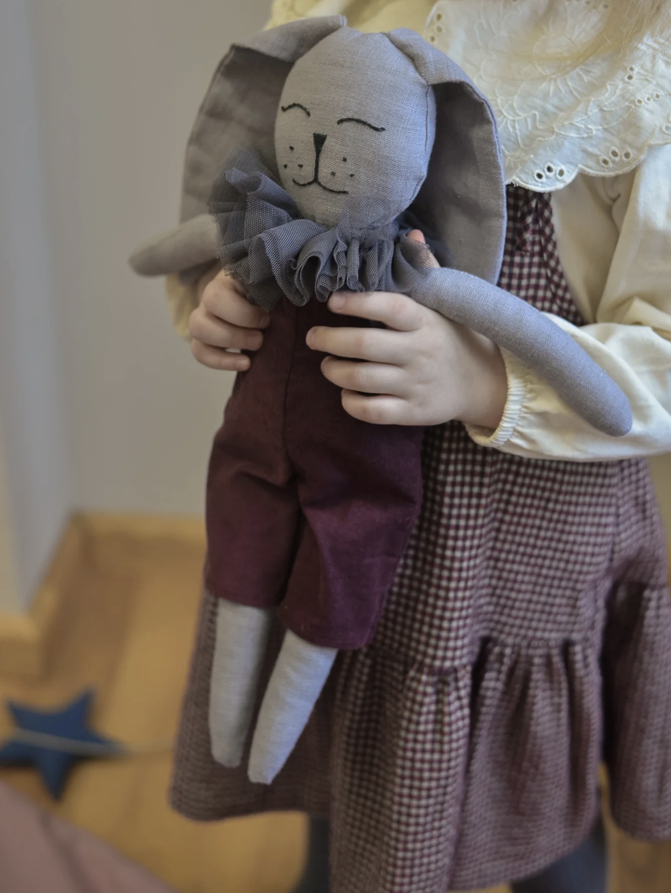 Hand made linen bunny- burgundy outfit, stuffed with lamb wool, aproximetly 40cm, without ears. Will make lovely present for child or lovely interior piece.